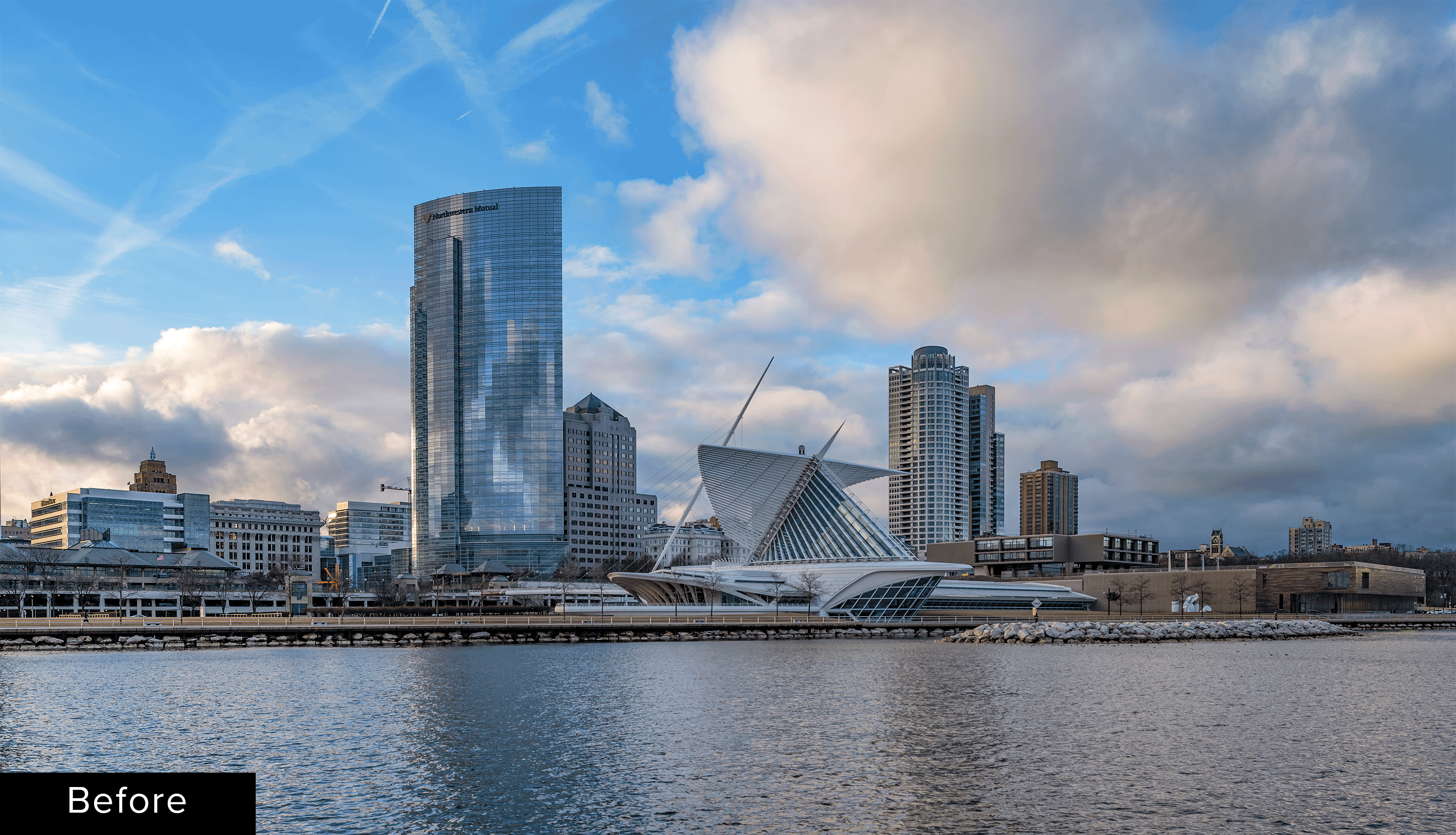 The Carbon Agency’s client Northwestern Mutual, was not fond of the dark sky and wanted the buildings reflections diminished and overall lightened and color corrected.